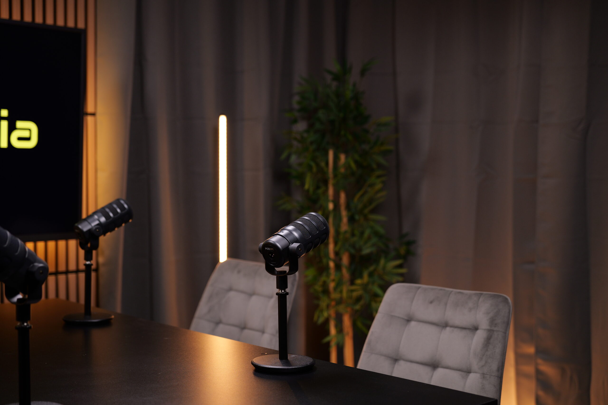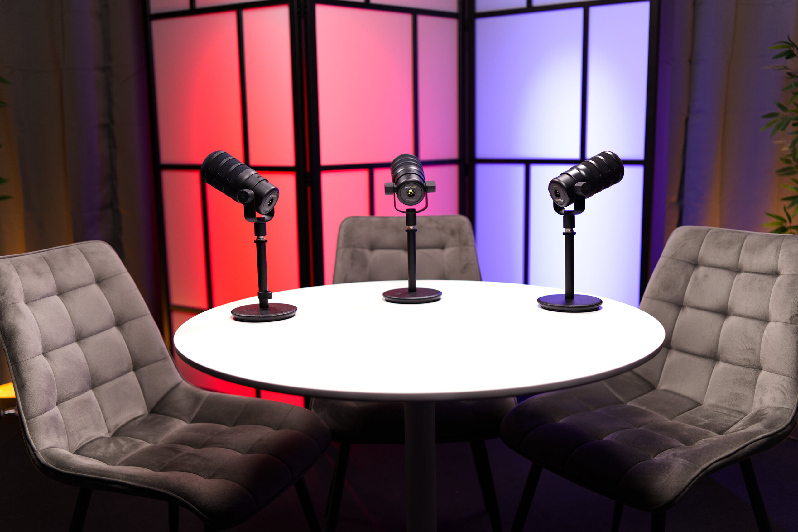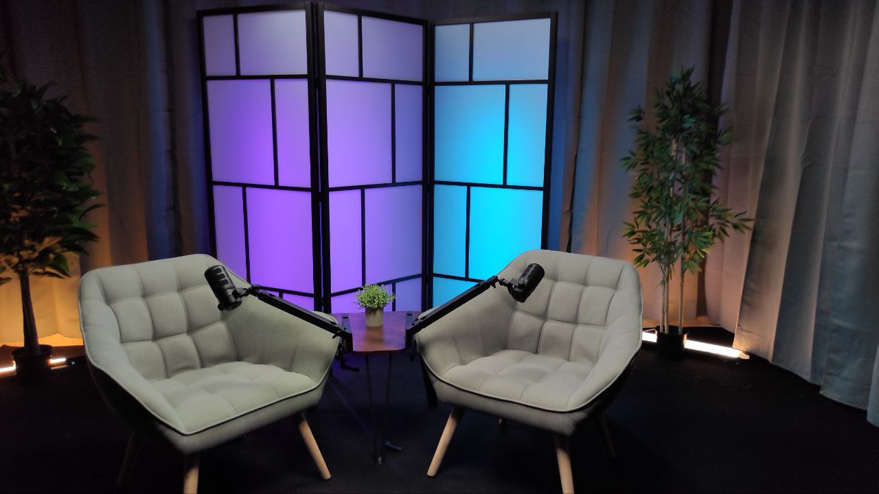 Un set relajado y sofisticado con dos cómodos sillones, ideal para grabaciones de 2 personas. Su diseño moderno crea un ambiente acogedor para conversaciones profundas.